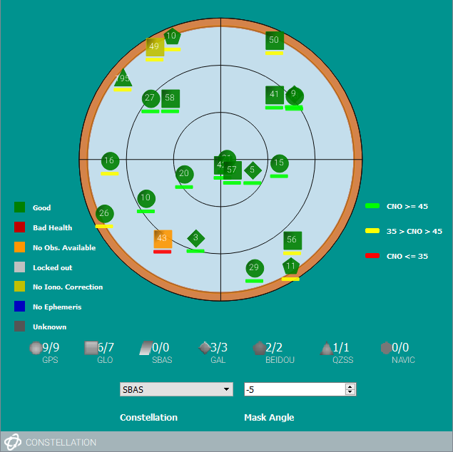 The mask angles are shown as colored rings on the Constellation window and full size tile. Satellites below the mask angle are not tracked.