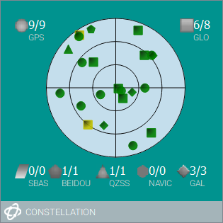 The Constellation tile displays each satellite the receiver is tracking. Concentric circles from 0° to 90° represent elevations from the horizon to directly overhead.