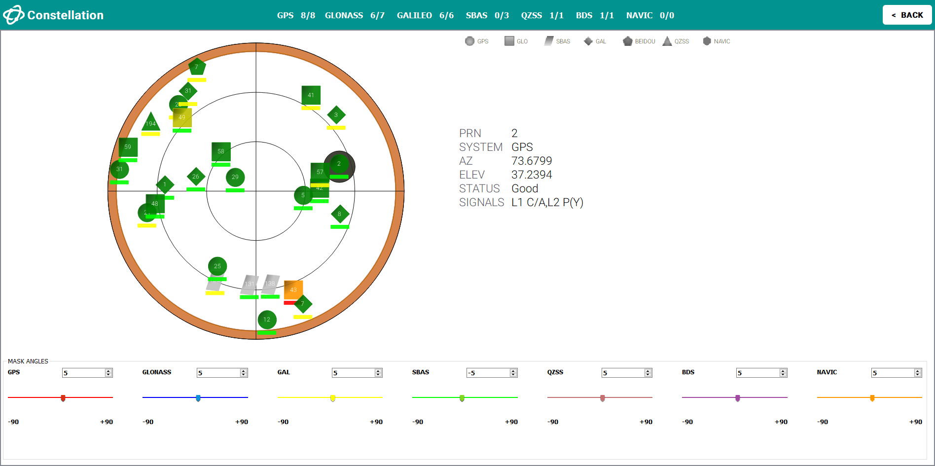 The color of the icon indicates the status of satellite. For more details on the color code for the satellite channel, see Satellite color codes. In addition, the signal strength appears as a color-coded bar below the satellite icon on the Constellation window and full size tile.