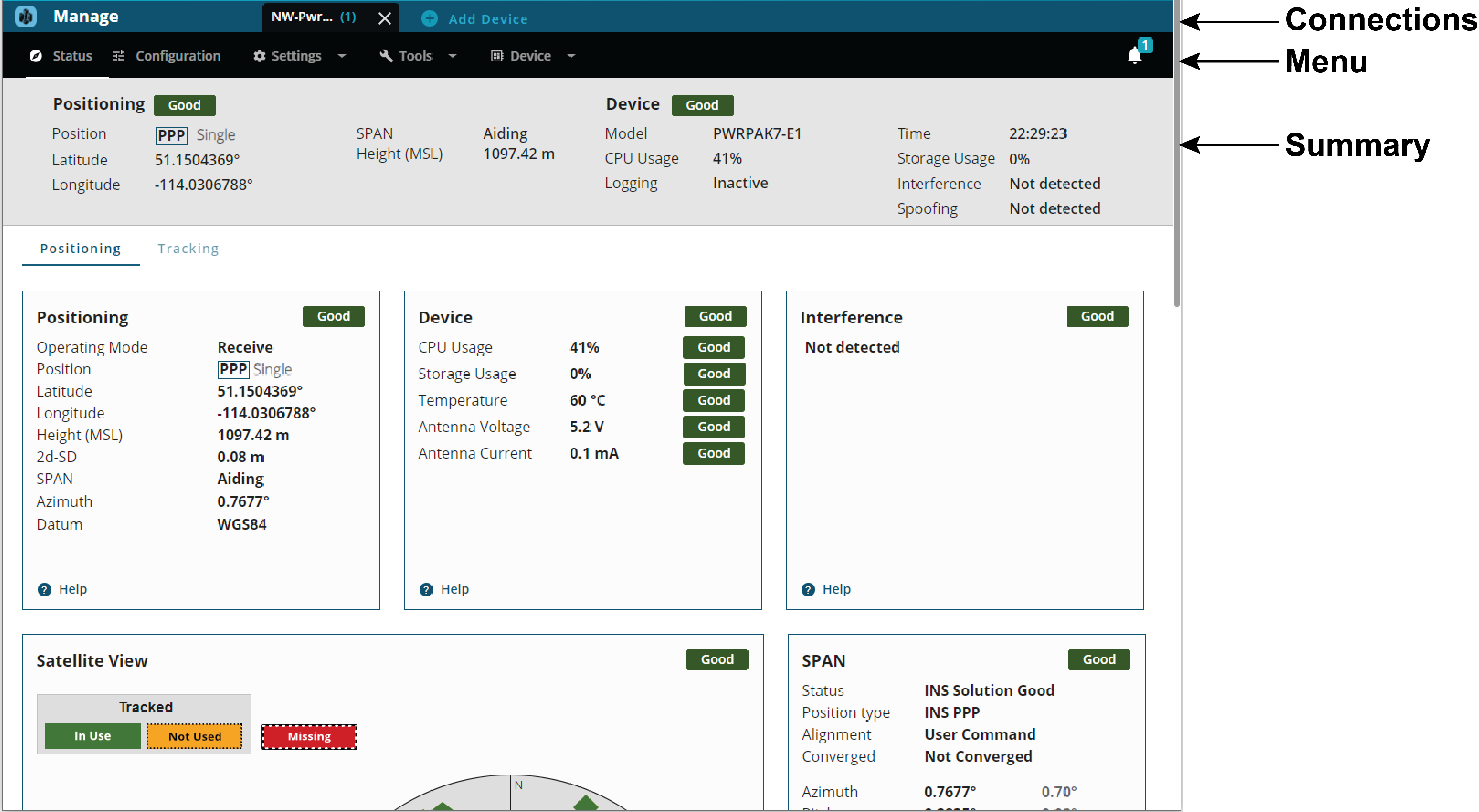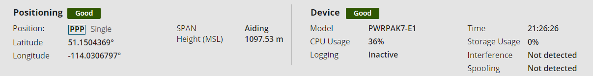 The SPAN field shows the status of SPAN GNSS+INS technology.