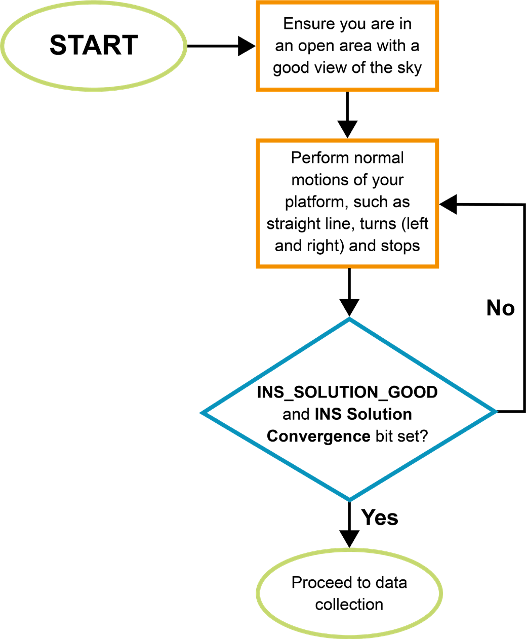 As previously mentioned, it is very important to ensure INS alignment takes place in a relatively good GNSS environment. Right after initial INS alignment, it is necessary to insert the appropriate type of kinematics into the system to converge the bias-drift states being modeled. It is suggested to perform the following iterative process, which could take up to three minutes depending on the dynamics the platform is capable of. During this period the INS status should transition to INS_SOLUTION_GOOD and the INS Solution Convergence bit (bit 6) should update to set in the Extended Solution Status of INSPVAX log. INS filter confidence can be monitored through the INS standard deviations in the INSPVAX log. Initializing the INS and entering an urban canyon immediately after is not recommended. SPAN will not behave as per product sheet levels unless it has been properly initiated and this includes the initial kinematics. If possible, start logging data from the very beginning to ensure all information is captured should there be any issues. |