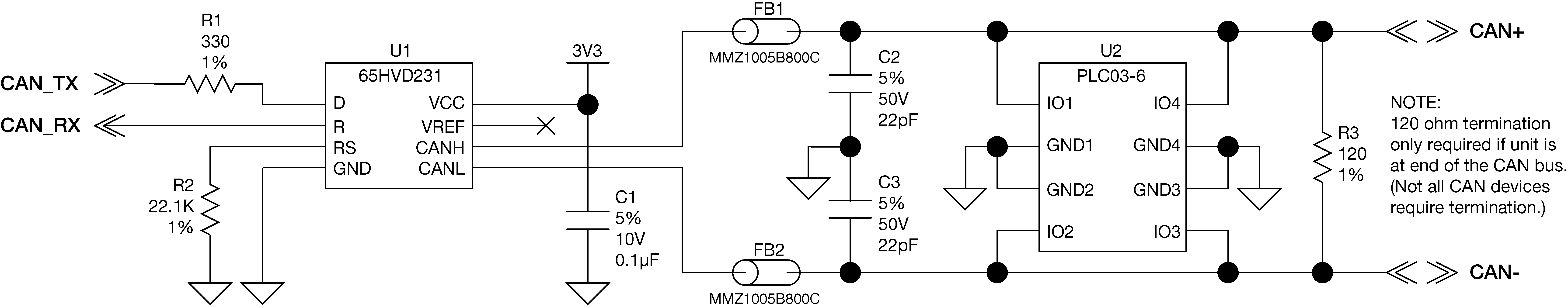OEM7 receivers provide 3.3 V CMOS-level CAN controller ports. An external CAN transceiver is required. The following figure shows a typical CAN transceiver implementation.
